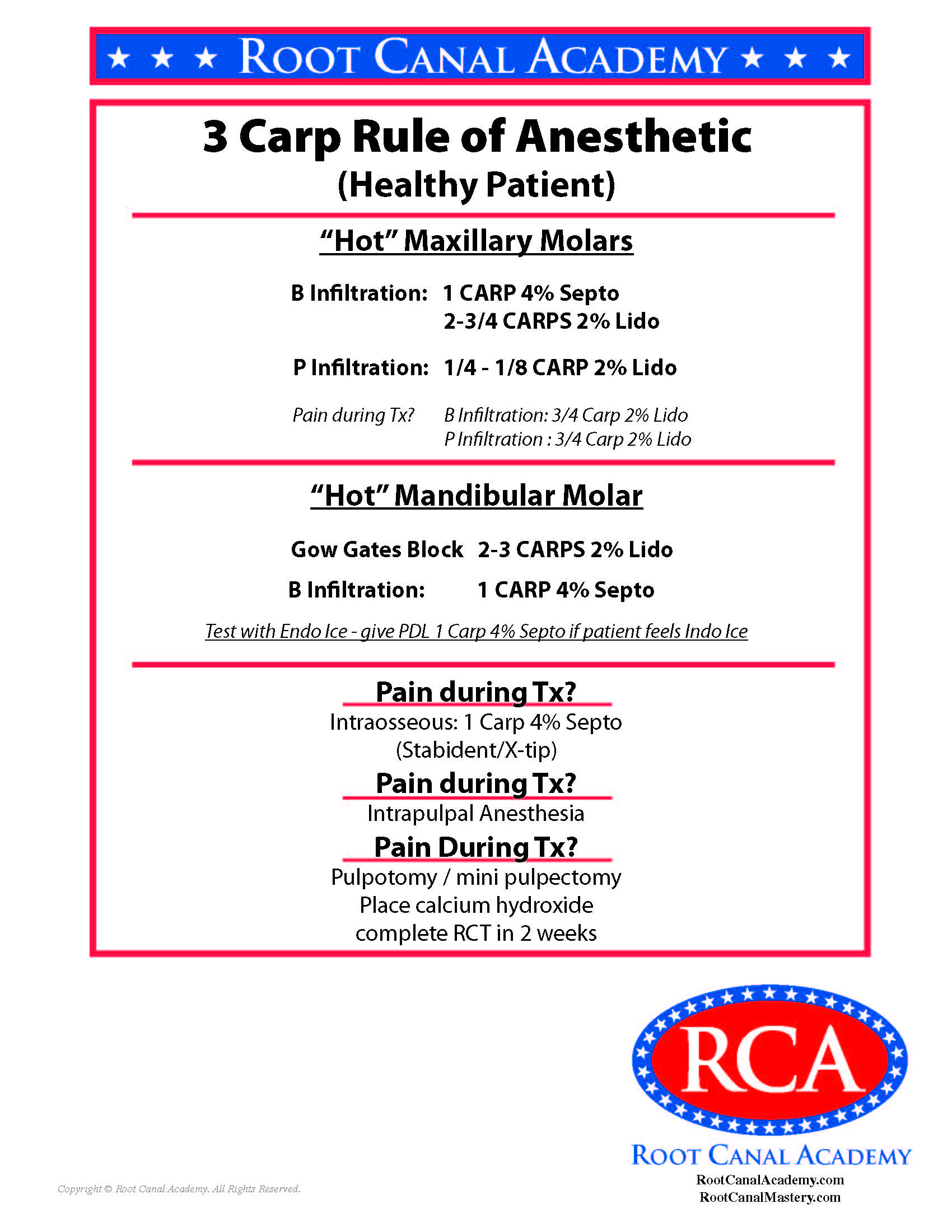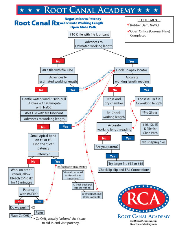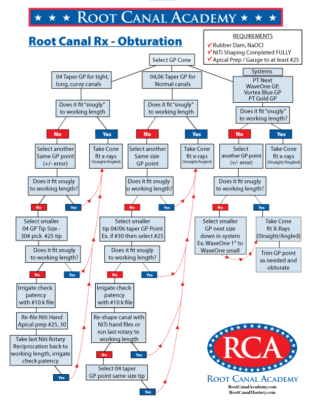 RCA Procedure Charts Root Canal Academy’s procedure charts provide detailed step-by-step tasks, decision points, and alternatives for each step of treatment. Obturation Negotiation-Accuracy-Glide Path RCA Graphic – Root Canal Game Overview RCA Graphic – BioCeramic Sealer Obturation 3 Carp Rule of Anesthetic